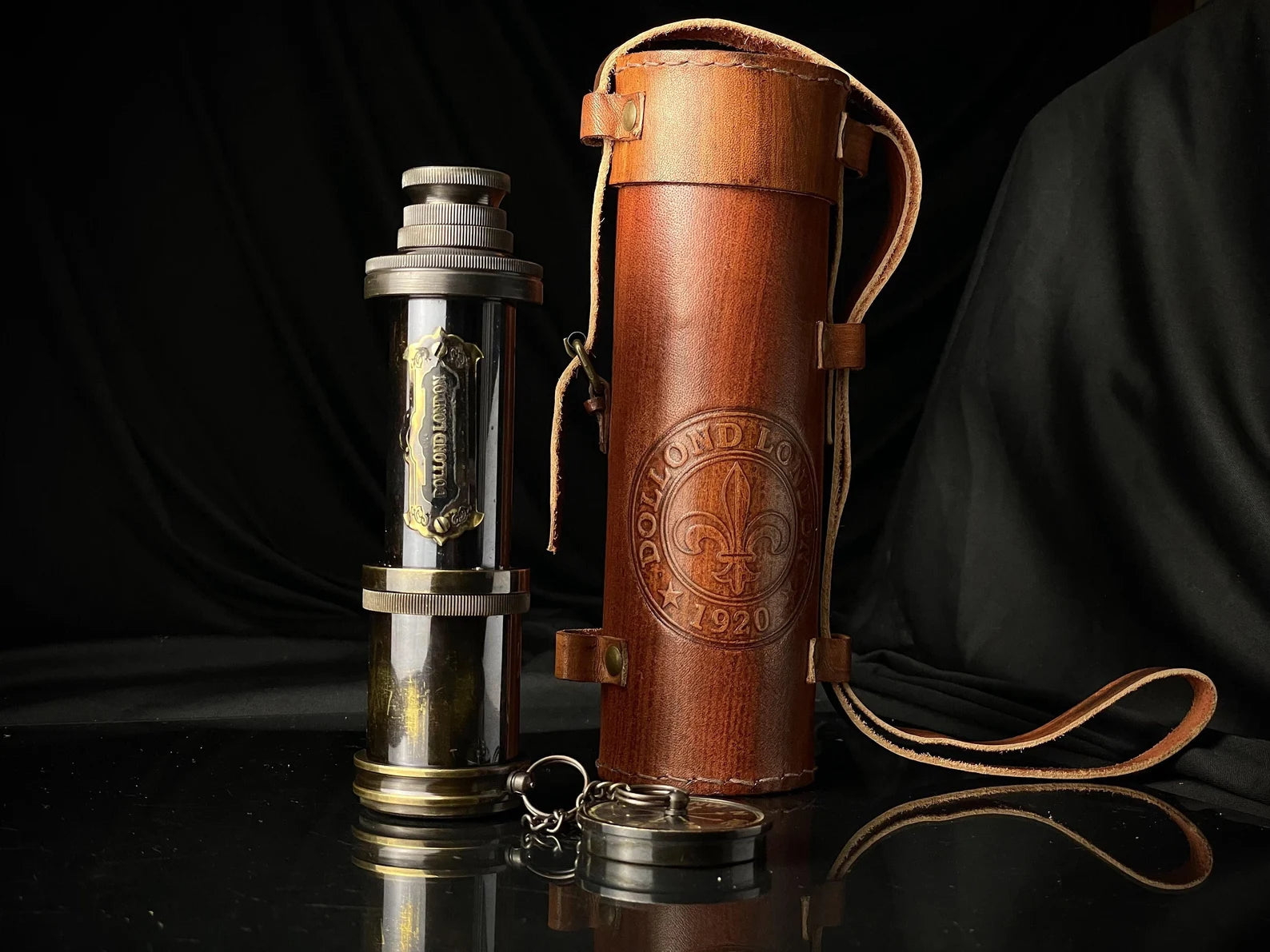Accompanied by a leather carrying case and compass, this piece speaks to travel, study, and the quiet ritual of observation. While fully functional, it is equally suited as a decorative object—resting on a study desk, bookshelf, or within a cabinet of curiosities.